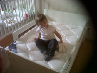 Ce berceau ne va pas servir longtemps mais cet achat était indispensable sachant qu'on habite une maison sur 3 niveaux, que les chambres des enfants sont au premier et celle des parents au deuxième étage. Imaginez la galère des nuits chaotiques ou il faut se lever parfois 20 fois pour câliner, nourrir, changer bébé... Donc à nos côtés au début, tout le monde sera plus tranquille. Même Thélia, qui ne sera pas dérangée les nuits par Mr ou Mlle Kinder ^^  Message déposé le 23.06.2011 à 18:07 - Commentaires (7)